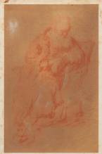 Roodkrijttekening of crayonmanier: kopie van de 'zittende oude man, voorwaarts leunend' van Rembrandt uit de collectie van het Teylers Museum (zie RKD Images, referentienummer 225881), r.o. op het witte papier vaag in potlood geschreven Rembrandt v. Rijn, 19e eeuw -sterk verbruind vervaagd-, 21 × 13,5 cm