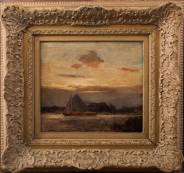 Louis Bron (1884-1959), kustgezicht met zeilboot in avondzon, olieverf op paneel, verso gesigneerd, 30 × 34 cm
