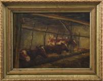 Hollandse School: koeien in de stal, olieverf op doek, r.o. gesigneerd H. Winter, 30 × 40 cm