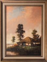 Robert de Haan (1943), boerenhoeve aan het water, olieverf op doek, r.o. gesigneerd, 69 × 49 cm