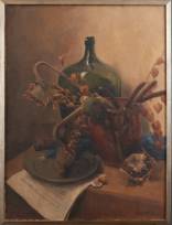 Hollandse School, 'Dorre Zonnebloemen', olieverf op doek, r.o. gesigneerd J.H. Hoppenbrouwers, verso getiteld, gemonogrammeerd en gedateerd '45 -beschadigingen-, 80 × 60 cm