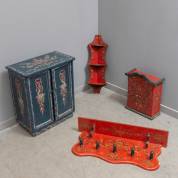 Hindelooper beschilderde kapstok, hoekkastje, en twee tweedeurs kastjes voor poppenkleertjes, 20e eeuw -defecten-, blauwe kastje 57 × 50 × 27 cm