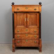 Eikenhouten luierkabinetje, bovenop twee zwart gelakte bollen, deuren geflankeerd door zwartgelakte zuilen, vier lades en blokpoten, met latoenkoperen beslag, laat empire -krimpscheuren en gebruikssporen-, 165 × 96 × 47 cm