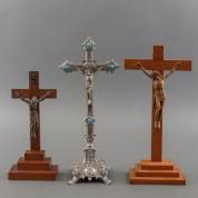 Drie kruisbeelden: twee houten met gegoten tinnen Corpus Christi en één van zamak, mogelijk 20e eeuw, Frankrijk of België, hoogste 40 cm