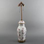 Porseleinen vaasvormige lampvoet met messing monturen en polychroom decor: bloemen en familiewapen, circa 80 × Ø 20 cm