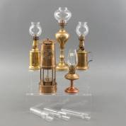 Diverse messing olielampen, waaronder: E. Thomas & Williams Brass mijnwerkers lamp, Cambrian #10492, Wales, daarbij: drie lampglaasjes