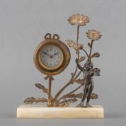 Verguld messing tafelklokje met strikomlijsting en bloemtak waarnaast cherubijn, op albast basement, circa 1900 -verguldsel sleets, cherubijn mogelijk niet origineel, basement met butsen-, 22 × 18 × 10 cm