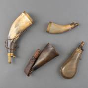 Vier hoornen kruithoorns, alle 19e eeuw, grootste 26 cm lang