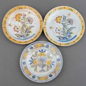 Drie Delfts aardewerk bordjes met polychrome bloemendecors, uitvoering De Porceleyne Fles, Delft, circa 1900 -randschilfers-, grootste Ø 23,8 cm