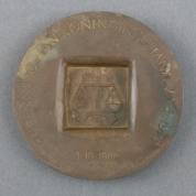 Bronzen legpenning, met aan de voorzijde een weegschaal in reliëf en inscriptie: '1e penning aan koningin Juliana 23-5-1979 - 1-10-1988', en op de keerzijde het voormalige gebouw van het ministerie van Justitie in reliëf, en daaromheen inscriptie 'Ministerie van Justitie', Ø 8,7 cm