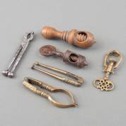 Verzameling van vijf metalen en één houten notenkrakers, 18e en 19e eeuw, langste 11 cm