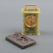 Opwindbaar tafelklokje / reisklokje in lichtgroene natuurstenen kast, adres: George Farrer Ltd, Engeland -loopt goed-, daarbij: Bois durci reliëfje: Cupido
