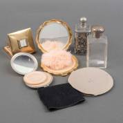 Drie diverse poederdozen, waaronder: vergulde geguillocheerde poederdoos, het deksel gezet met horloge waaromheen markasietjes, uitvoering Anker, jaren '40, daarbij: twee glazen parfumflessen waarvan één met 1e gehalte zilveren dop, Londen, 1901, vergulde poederdoos 7,5 × 7,5 cm