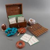 Lotto- of bingospel met gedraaide rozenhouten onderdelen en papieren bordjes met getallen, het mahonie kistje met inscriptie in het deksel: J.V.D. ANNO 1714, maar 19e-eeuws -krimpscheur in deksel-, 13 × 23 × 18 cm