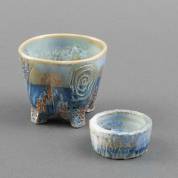 Elysia Verhoeven (1953), twee werken: geglazuurd aardewerk bakje, en geglazuurd aardewerk bakje op vier pootjes, beide onderop gesigneerd, bakje op pootjes 8 × Ø 9 cm