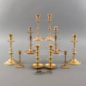 Diverse messing kandelaars, en lontenknipper, hoogste 23 cm