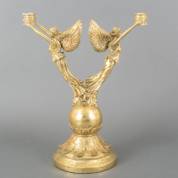 Goudkleurige gipsen tweelichts kandelaar met twee gevleugelde Nikès op een bol, modern, 48 × 39 × 20 cm