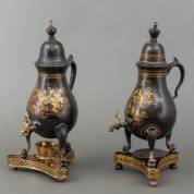 Twee zwartgelakte tinnen kraantjeskannen met gouden bloemdecor, messing kraan en komfoor, 19e eeuw -decor wat sleets, gebruikssporen-, circa 40 cm