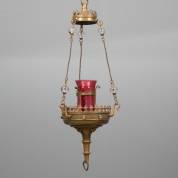 Messing godslamp met glazen kralen en rood glaasje, 20e eeuw, 83 × Ø 30 cm