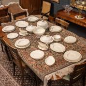 Creamware serviesgedeelte, model Wellesley, uitvoering Wedgwood of Etruria & Barlaston, bestaande uit: twee dekselterrines, kom, twee saucières, punchbowl, vier diverse ovale dienschalen, soepkom op onderschotel, negen diepe borden, acht dinerborden, en elf ontbijtborden -gebruikssporen, borden beboterd-, daarbij: twee lederen draagbanden