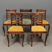 Vijf bruingebeitste stoelen, waarvan één armstoel -licht sleets-
