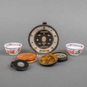 Divers kleingoed: reliekschrijn met relieken van de Heilige Johannes Berchmans en de Heilige Franciscus van Paola; lakwerk dekseldoosje met reliek in het interieur; vogelesdoorn en schildpad dekseldoosje met roségouden schildje; schildpad dekseldoosje met parelmoer medaillon in het deksel, beide 19e eeuw; en twee polychroom beschilderde opaline kommetje met Chinees decor, Duitsland, 18e eeuw, laatstgenoemde 3,5 × Ø 7,5 cm