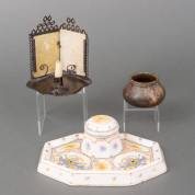 Plateel inktstel met polychroom gestileerd bloemdecor Helène, Plateelbakkerij Zuid-Holland, 1904 -gecraqueleerd, chip en inktvlekken-, metalen blaker met twee lithofaan paneeltjes -één paneel gebroken, defecten-, en bruingeglazuurd keramiek potje, gesigneerd Meta Neven-Rozelaar (1914-2011), inktpot 8 × 24 × 17 cm