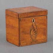 Rechthoekig mahonie theekistje met schelpinlegwerk in het deksel en front, 19e eeuw -kleine defecten op de hoeken-, 11,5 × 11,7 × 9,3 cm