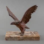Bruingepatineerd bronzen beeld in de vorm van een adelaar met gespreide vleugels, op een niet originele marmeren voet, 18,5 × 17,5 × 9 cm