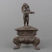 Driehoekige bronzen inktpot op klauwpootjes, het reservoir met guirlandedecor, het deksel in de vorm van een luitspelende engel, 19e eeuw -binnenreservoir ontbreekt-, hoogte 19 cm