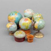 Zeven diverse miniatuurglobes, grootste Ø 5,5 cm