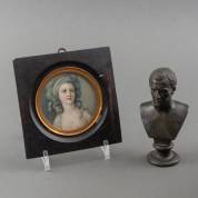 Bronzen buste van keizer Augustus, 19e eeuw, 15 cm hoog, en een ingelijste litho van Zofia Potocka (1760-1822) naar een schilderij van Anton Graff, 20e eeuw, Ø 9,5 cm