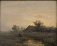 Hollandse School: landschap met visser en boerderij in het verschiet, olieverf op paneel, niet gesigneerd, 19e eeuw, 12 × 15 cm