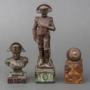 IJzeren Napoleontische kogel, Ø 50 mm, afkomstig van het beleg van Kolberg, 1807, op albasten voet en voorzien van twee koperen plaatjes, hoogte 12 cm, daarbij: twee beeldjes van Napoleon in verschillende materialen uitgevoerd, hoogste 27 cm