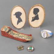 Zes stuks kleingoed: Hindelooper prikslee -defect-, twee broches, twee miniatuurportretten uit de familie Brandt Corstius, en een porseleinen servetring met de letter 'E'
