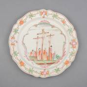 Grote creamware schotel met polychrome voorstelling van de kruisiging, Engeland, laat 18e eeuw -craquelures, verfspetters achterzijde-, Ø 43 cm