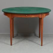 Ovale iepengefineerde tafel, het blad met groen vilt bespannen, met lade onder het blad, staand op taps toelopende iepen poten, eind 19e eeuw, 75 × 109 × 83 cm