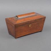 Sarcofaagvormige palissander theekist met twee theecompartimenten en plek voor een kom -interieurdelen ontbreken, defecten-, begin 19e eeuw, 14 × 28 × 24 cm
