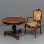 Mahoniegefineerde kindertafel, biedermeier -kleine fineerschades en vochtplekken in blad-, en notenhouten kinderstoel, Louis Quinze-stijl, 20e eeuw, tafel 47 × Ø 63 cm