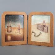 Tweeluik: enerzijds een figuur bij een put, anderzijds figuur met slang, olieverf op paneel, r.o. gemonogrammeerd DB, per paneel 28 × 21 cm