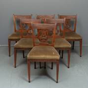 Zes iepenhouten stoelen met groene velours bekleding, de rug met opengewerkt harpvormig snijwerk, Hollands, circa 1810 -gebruikssporen-, 89 × 48 × 38 cm