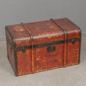Hutkoffer met houten banden en zwartgelakt metalen beslag, deksel met initialen: 'v.S.H', 20e eeuw -gebruikssporen, één greep ontbreekt-, 44 × 75 × 43 cm