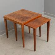 Paar palissandergefineerde bijzettafeltjes op taps toelopende poten, in de stijl van Severin Hansen, uitvoering onbekend, jaren '60 -gebruikssporen-, 48 × 50 × 50 cm