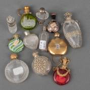 Twaalf diverse kleine parfumflacons -één gelijmd-, grootste 8 cm