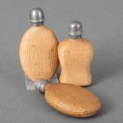 Drie glazen parfumflacons met gevlochten riet en tinnen dop -één dop zit los-, 10 cm