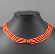 Vierstrengs bloedkoralen kralencollier aan rechthoekig verguld slot gezet met cabochongeslepen bloedkoraal, 60 cm