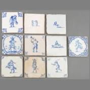 Tien aardewerk tegels met blauw-witte soldatendecors, 17e/18e eeuw -randbeschadigingen-