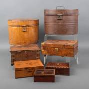 Verzameling van vijf diverse kistjes en twee hoedendozen -defecten-, de grootste 28,5 × 41 × 31,5 cm