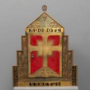 Messing tabernakel, de deur met kruis tegen rode achtergrond, daarboven de woorden Adoro Te, en daarom heen korenaren, wijnranken en driemaal het woord Sanctus, binnenin gestoffeerd en nog met enkele doosjes en pyxis, façade 68 × 54 cm, kast 45 × 28 × 27 cm