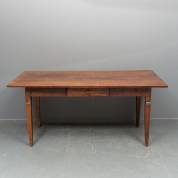 Rechthoekige eiken tafel met lade onder het blad, staand op taps toelopende poten, 20e eeuw -verkleuringen in blad-, 77 × 173 × 82 cm